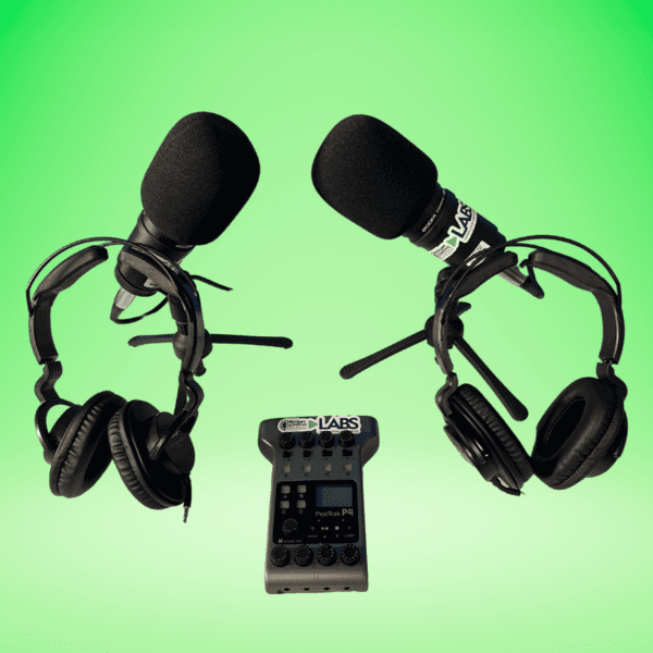 The Podcast Kit includes everything that is needed for a two-person team to create a ready-to-publish podcast! With two tabletop microphones and headphones and an easy-to-use audio mixer, students can learn about and experiment with audio capture in a variety of settings and edit interviews, podcasts, and audio stories using readily available free apps.